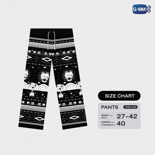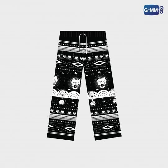Pantalón negro PERMPOON con estampado, con un diseño único bajo licencia exclusiva de GMMTV, que incorpora elementos relacionados con Mr. Thee (Pond) y Peach (Phuwin) de la serie Me and Thee, combinados meticulosamente en un diseño adorable y verdaderamente único. Confeccionado en seda italiana peinada, es suave, ligero y cómodo, con un corte prolijo que lo hace ideal para usar en distintas ocasiones.